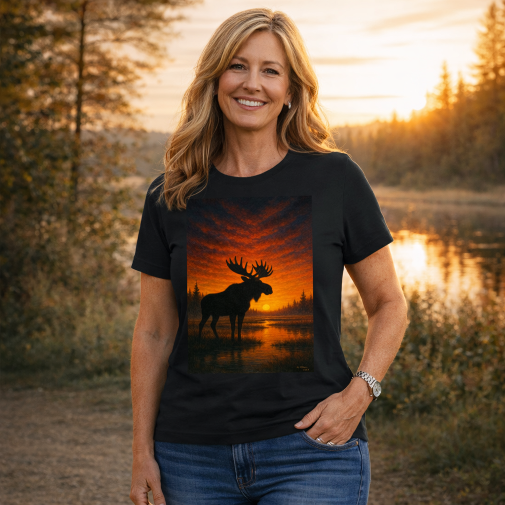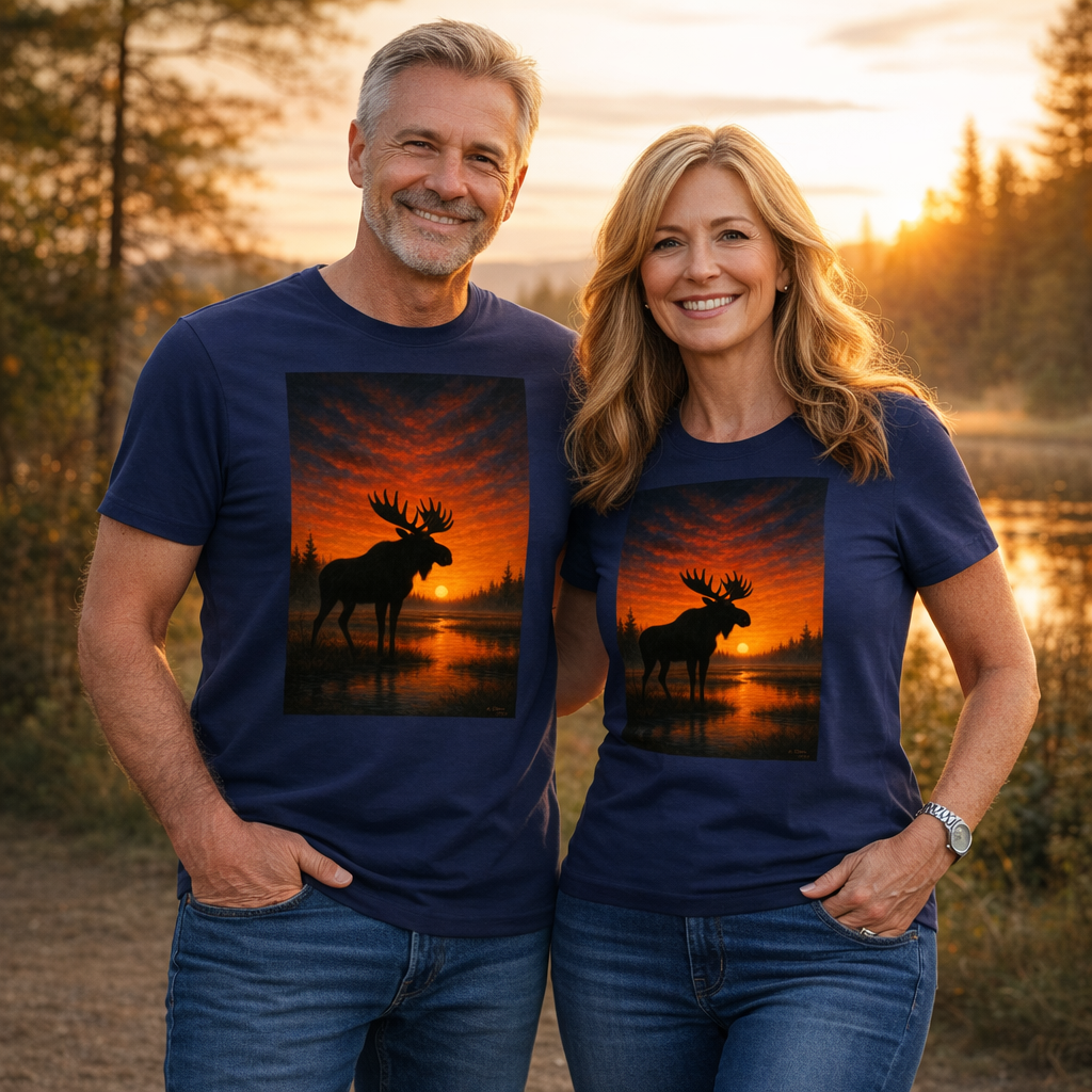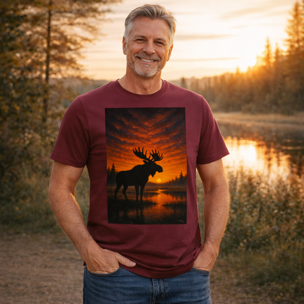 Opplev naturens magi med en klassisk t-skjorte med eksklusivt motiv av “Elg i solnedgang”. Motivet er inspirert av nordisk villmark og fanger øyeblikket når solen synker bak skogen og elgen står stille i landskapet.