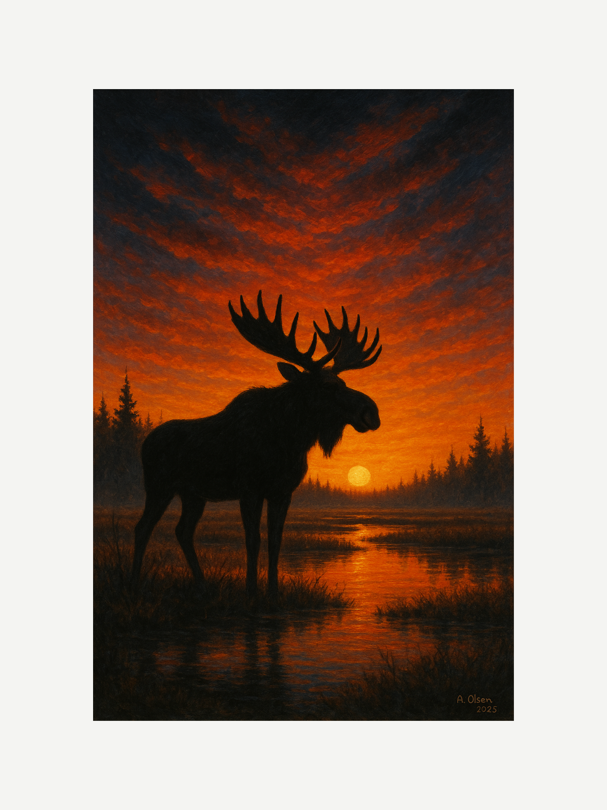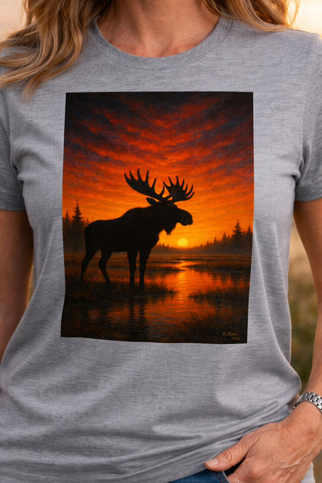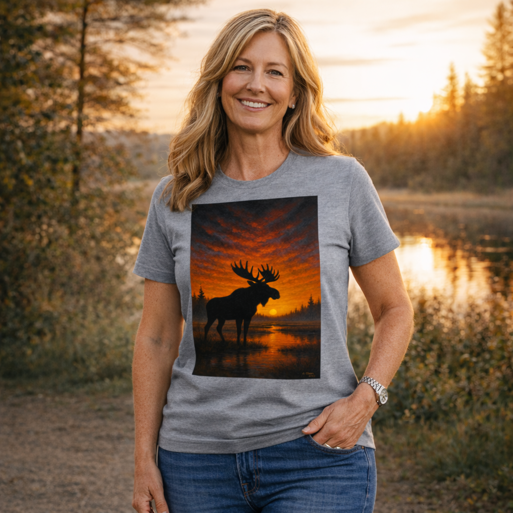 Opplev naturens magi med en klassisk t-skjorte med eksklusivt motiv av “Elg i solnedgang”. Motivet er inspirert av nordisk villmark og fanger øyeblikket når solen synker bak skogen og elgen står stille i landskapet.